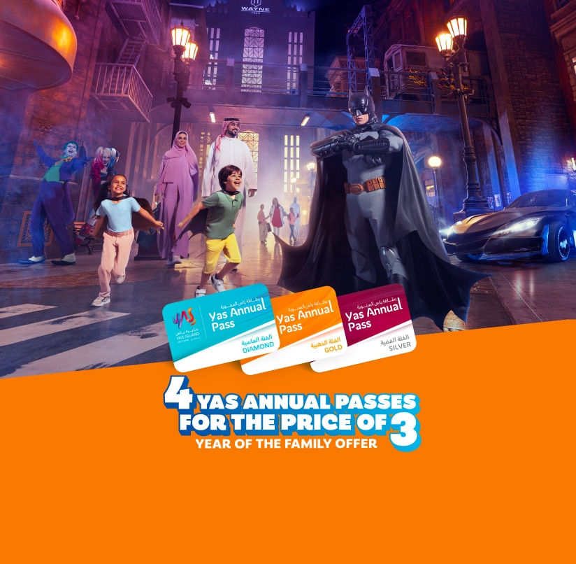 The wait is over. Your Yas Annual Pass is back on sale with incredible savings this Year of the Family!For a limited time only, get 4 Yas Annual Passes for the price of 3 and enjoy year-round access to 4 record-breaking theme parks - Ferrari World, Yas Waterworld, Warner Bros. World™, and SeaWorld® Yas Island, Abu Dhabi.